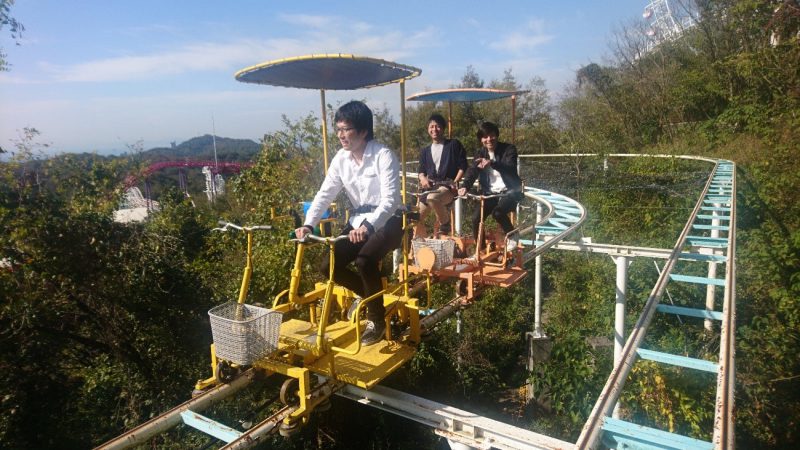 そして、地味に怖かったアトラクションはこれです。人気ダントツNo.1の「スカイサイクル」。自分たちで自転車の乗り物を漕いで一周するだけのアトラクションです。解放感のある乗り物で若干心許ない気もしますが、そこは気にせず出発です。出発直後はみんな笑顔で余裕です。