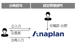 表計算シートを使用して計画策定を行っている企業は、「部門の計画担当が表計算シートに入力⇒メールで経営管理部門に送付⇒経営管理部門が転記」という表計算シートのバケツリレーになっていることが多いのではないでしょうか。その場合、計画担当の数が多いほど、経営管理部門の負担は重くなります。